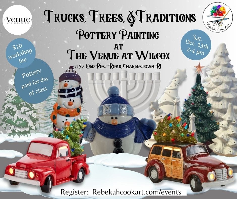 Celebrate the magic of the season at The Venue at Wilcox with Rebekah Cook Art! Join us for a heartwarming Trucks, Trees & Traditions Paint-Your-Own Pottery Workshop, where holiday nostalgia meets creative fun.